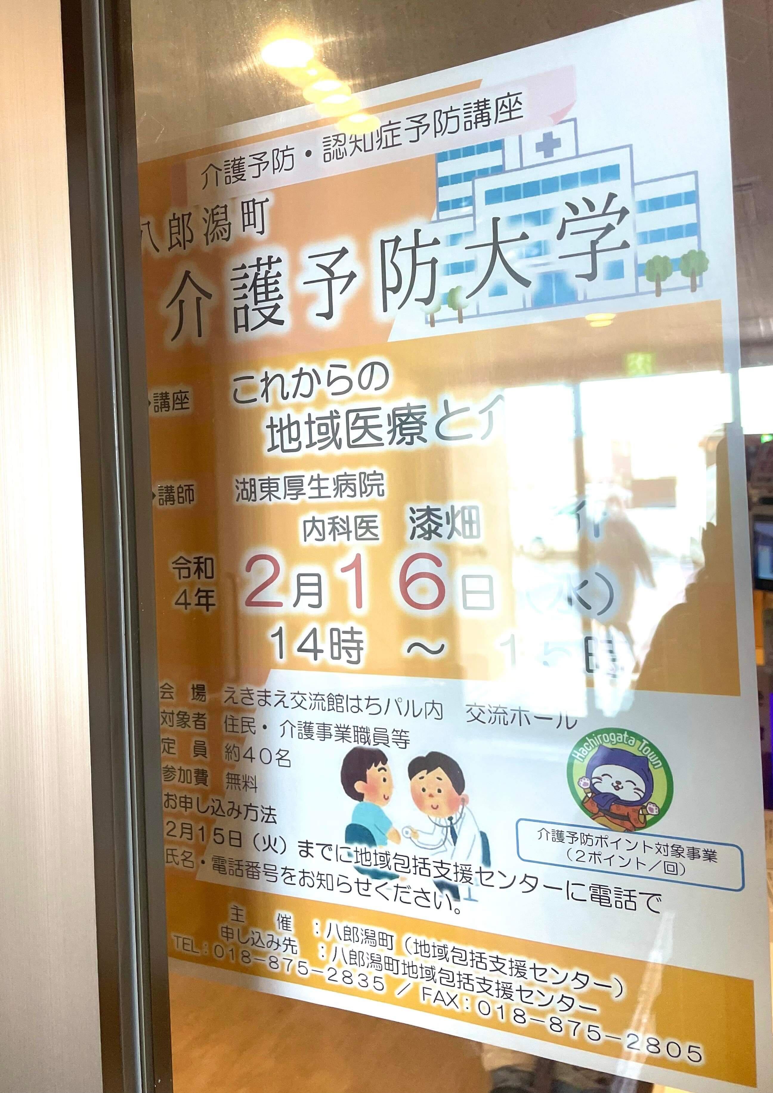 八郎潟町介護予防大学とは湖東分室がある五城目町の隣、同じ南秋田郡の八郎潟町で地域住民が自身でできる介護予防や認知症予防の知識を学び、認知症の人やその家族の立場に立って住み慣れた地域で元気に生活し、豊かな老後に向けた心とからだの健康づくりを目的とした講座です。