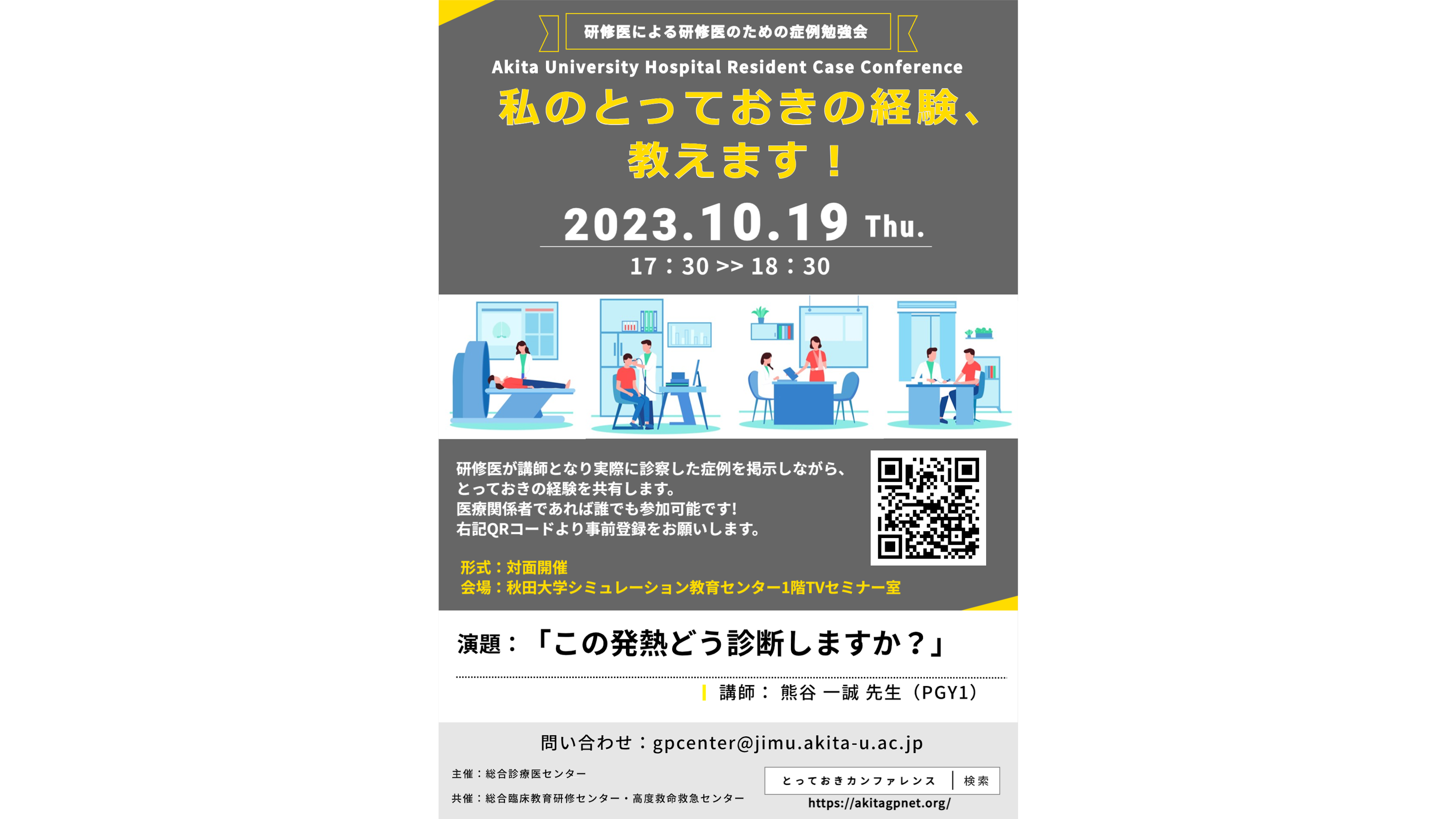 令和5年度_第5回目は「この発熱どう診断しますか?」をテーマに講師は熊谷 一誠 先生(研修医1年目)、担当指導医は亀山 孔明 先生(救急)が担当しました。