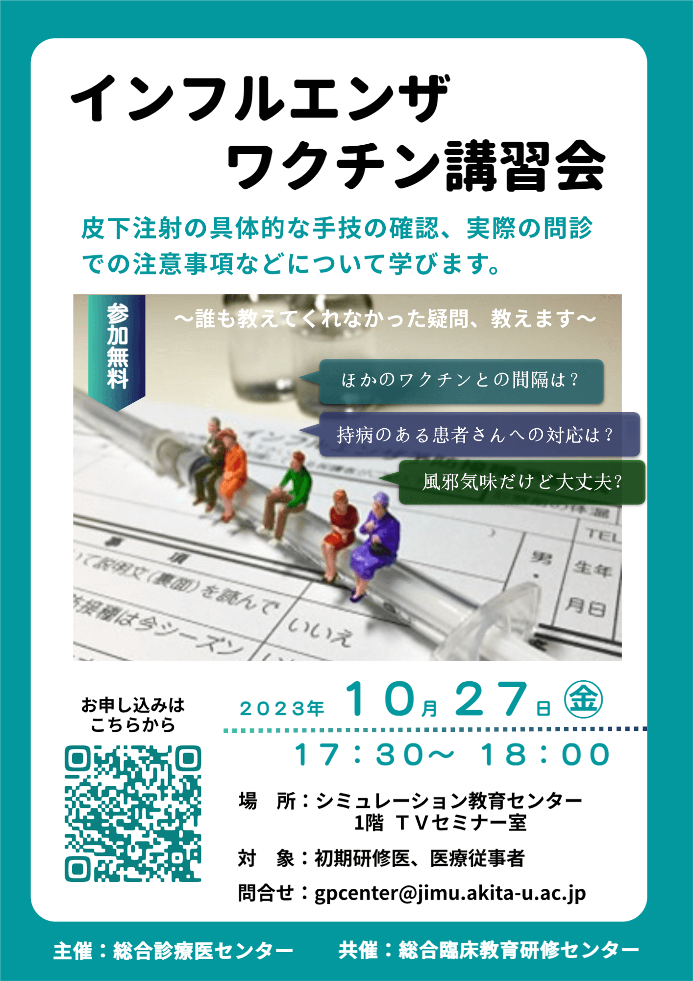 近年は秋田大学研修医のみを対象とした開催でしたが、今年は新型コロナウイルス感染症が5類感染症に位置づけられ、これを踏まえ以前のように県内初期研修医を対象に行うことができました。