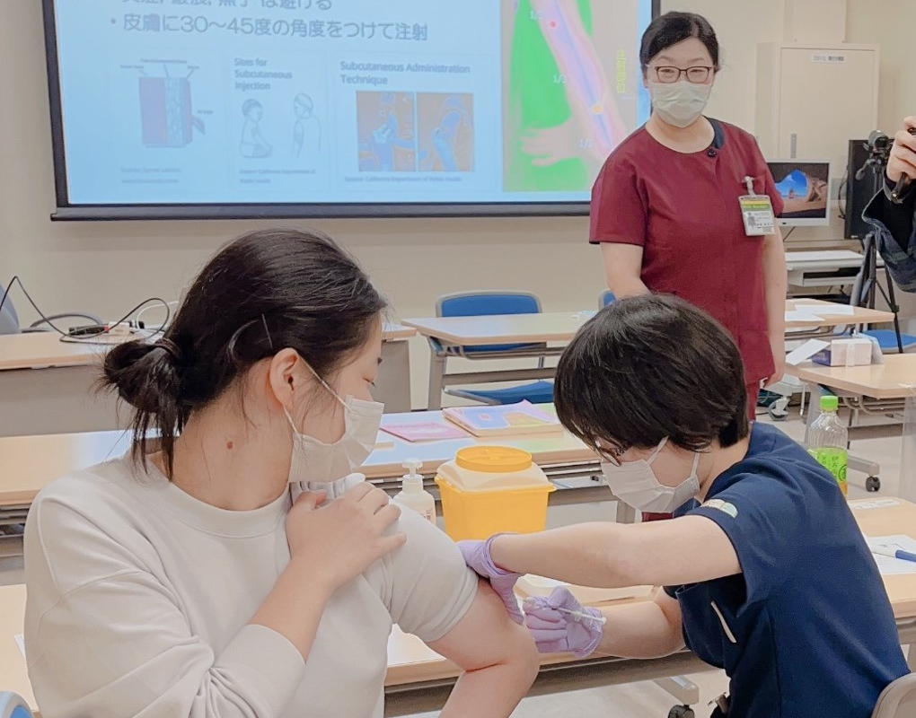 問診での注意事項や実際にあった患者さんからの質問を例に、確認ポイントや皮下注射についての注意事項などを講義していただき、講義後は皮下注射の実際について手技を行いました。