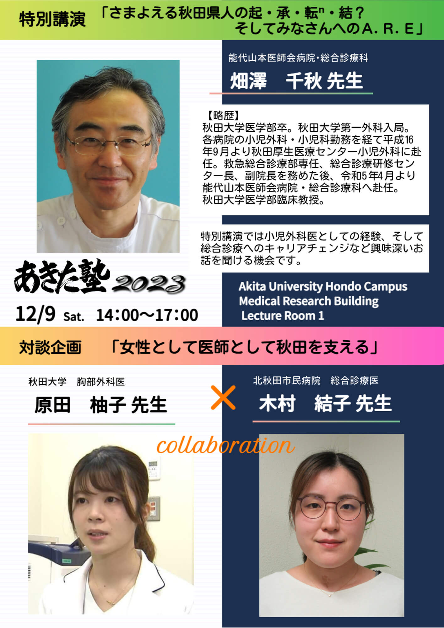 学生からもよくワークライフバランスについて質問をいただきますが対談企画では「女性として、医師として秋田を支える」をテーマに、お二人の先生の仕事や子育て、家庭のことなど、かなり赤裸々にお話してくださいました。