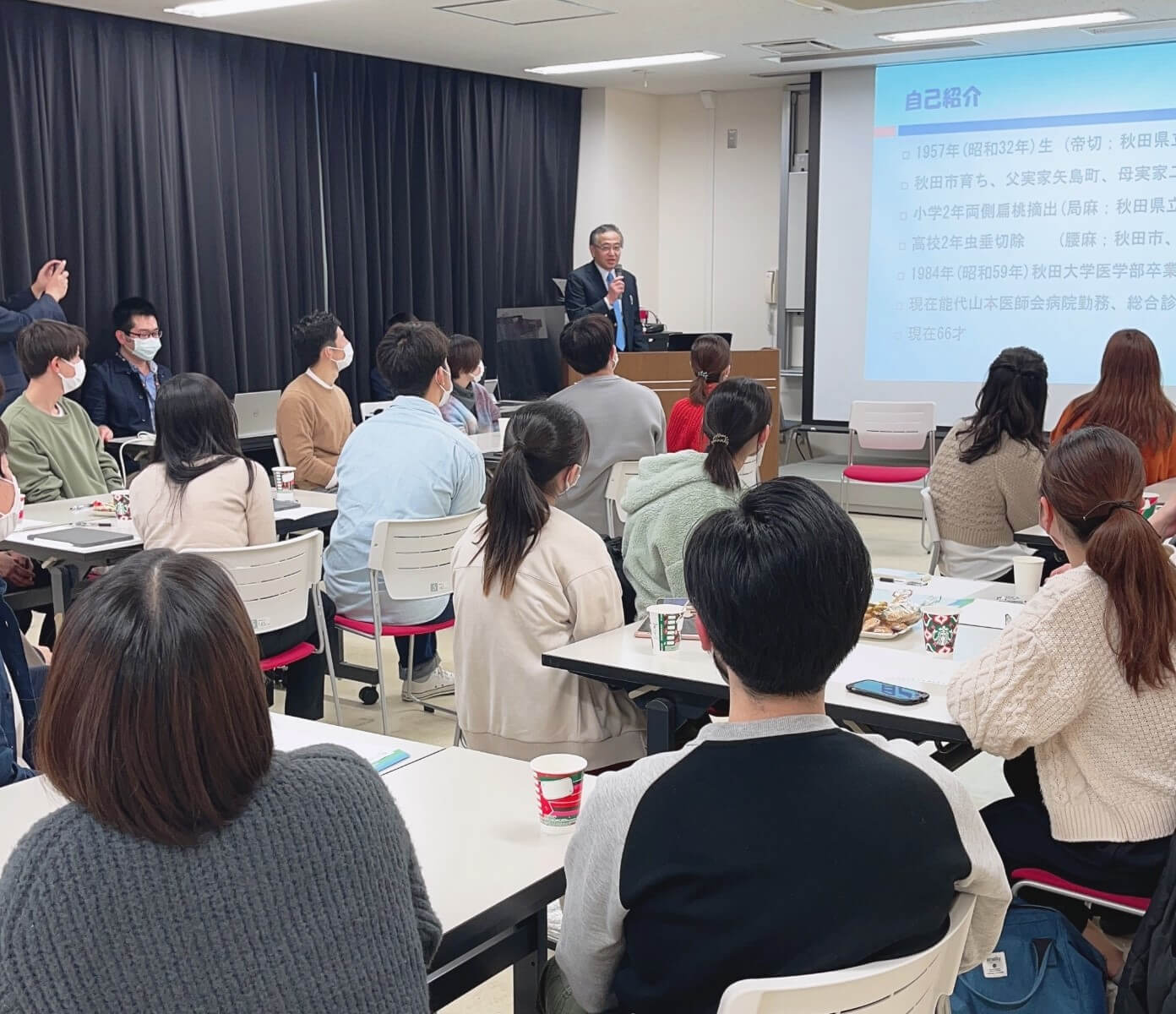 特別講演では【能代山本医師会病院 総合診療科:畑澤千秋先生】をお迎えし、先生が歩んでこられた小児外科、小児科、成人外科、そして総合診療科で仕事をする今に至るまでのキャリアパスや人との出会い繋がりなど、とてもユーモアたっぷりにお話していただき、笑いあふれる講演になりました。