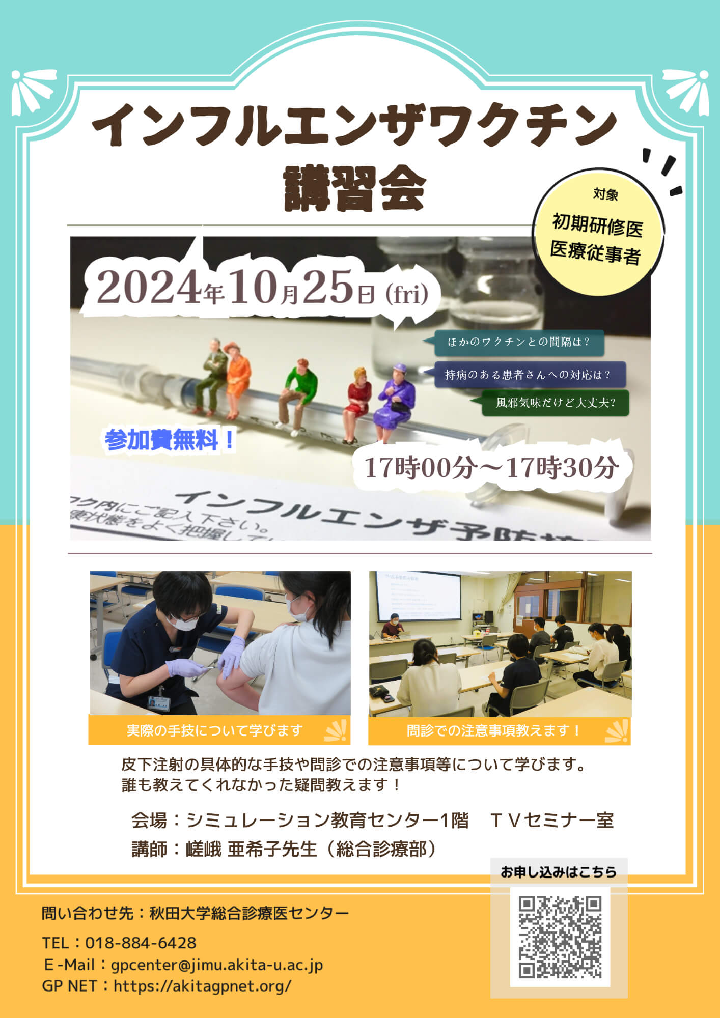 秋を感じる頃からじわじわと感染が始まることが予想されるインフルエンザですが、毎年秋田県内の初期研修医を対象としたインフルエンザワクチン講習会を開催しています。