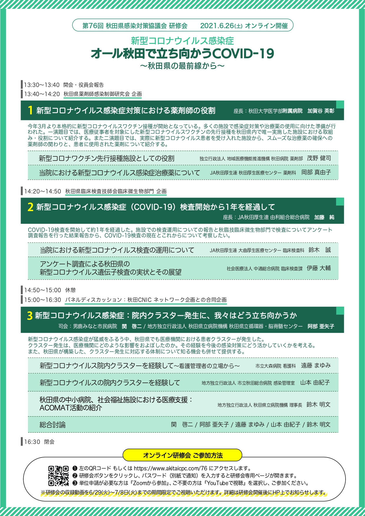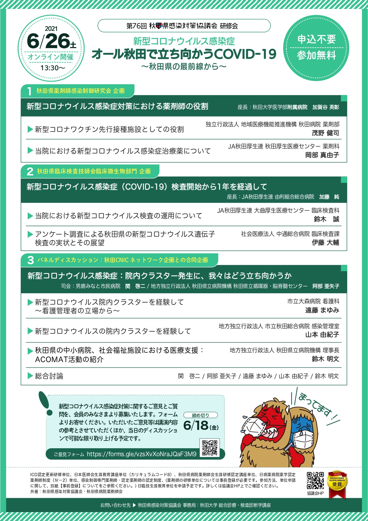 #第76回秋田県感染対策協議会をオンラインで開催しました。 HOME #第76回秋田県感染対策協議会をオンラインで開催しました。 秋田県内における感染対策の向上を目的として、その時々のニーズに沿った研修会やセミナーを開催しています。より詳しい内容は「秋田県感染対策協議会」ホームページをご覧ください。秋田県感染対策協議会