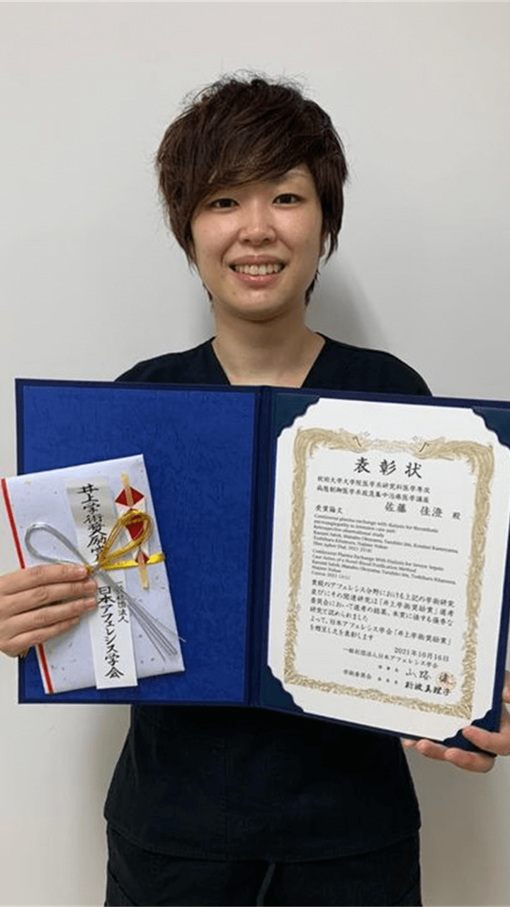 日本アフェエレイシス学会で佐藤佳澄先生が井上学術奨励賞を受賞しました HOME 日本アフェエレイシス学会で佐藤佳澄先生が井上学術奨励賞を受賞しました continuous Plasma Exchange with Dialysis療法を重症患者に応用した一連の研究が評価されました。
