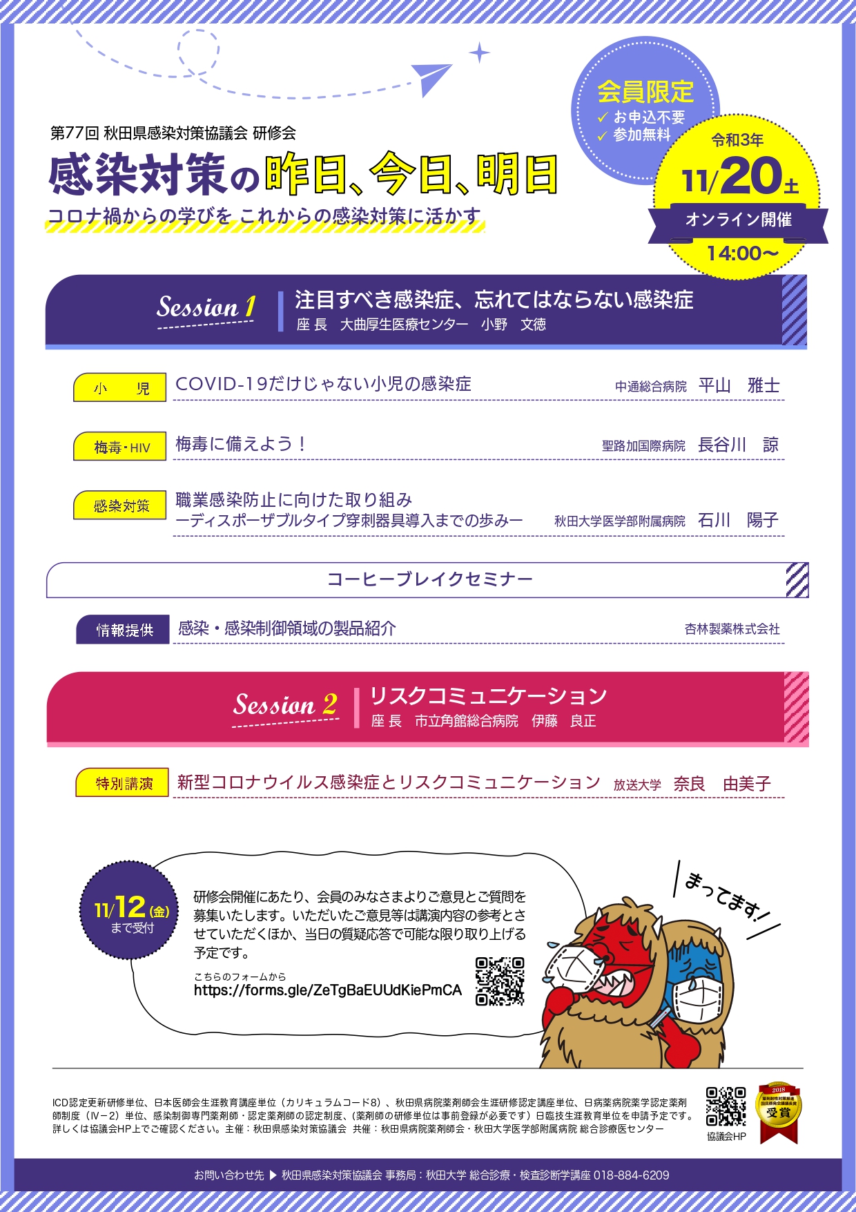 #第77回秋田県感染対策協議会研修会をオンラインで開催しました。 HOME #第77回秋田県感染対策協議会研修会をオンラインで開催しました。 詳しい内容は「秋田県感染対策協議会」ホームページをご覧ください。秋田県感染対策協議会