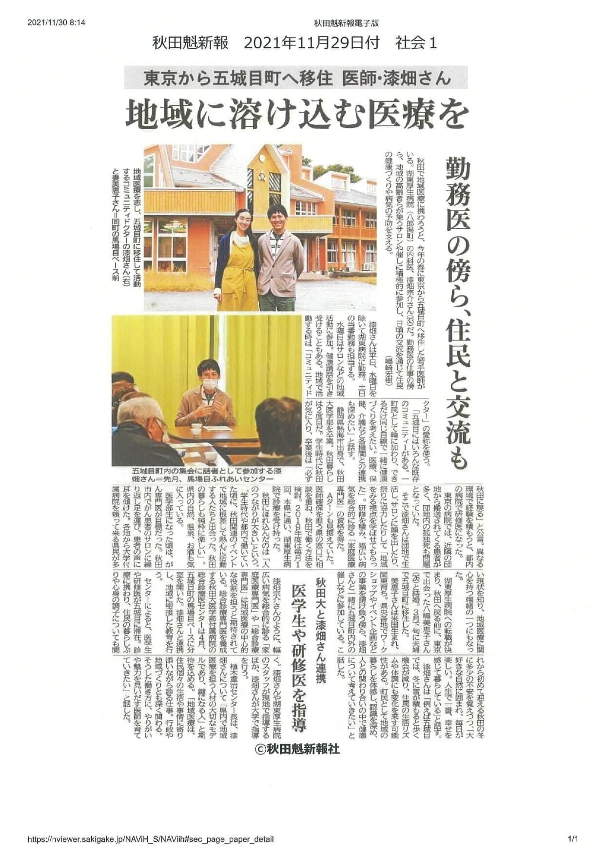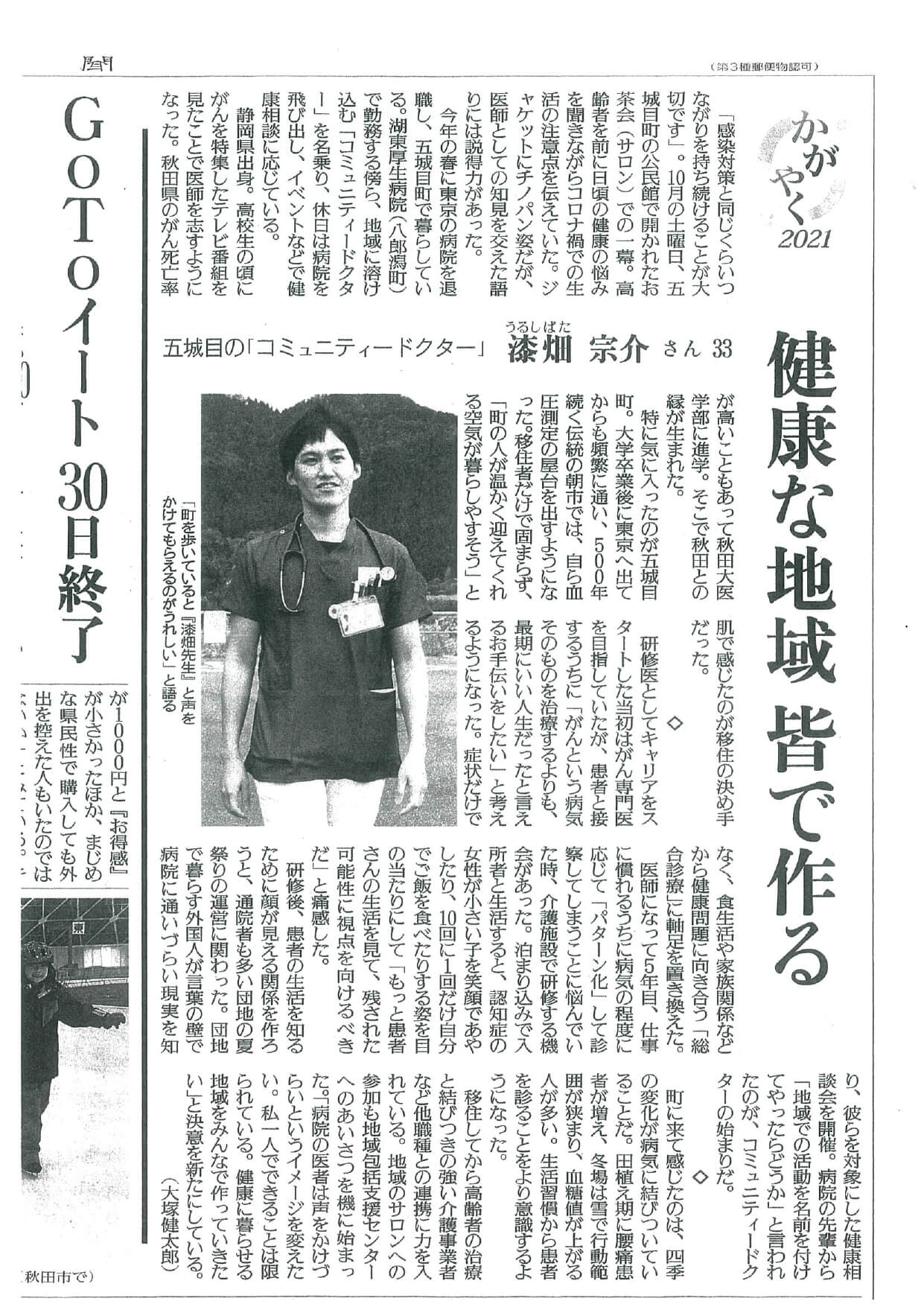 秋田魁新報社、秋田読売新聞に湖東厚生病院(湖東分室)の漆畑宗介先生のインタビュー記事が掲載されました。 HOME 秋田魁新報社、秋田読売新聞に湖東厚生病院(湖東分室)の漆畑宗介先生のインタビュー記事が掲載されました。 ①2021年11月28日(日)付 秋田読売新聞「健康な地域 皆で作る 五城目のコミュニティードクター」 ②2021年11月29日(月)付 秋田魁新報「地域に溶け込む医療を コミュニティードクター」