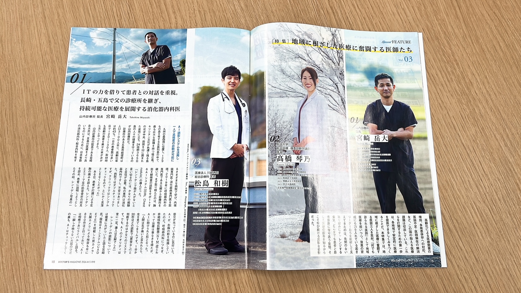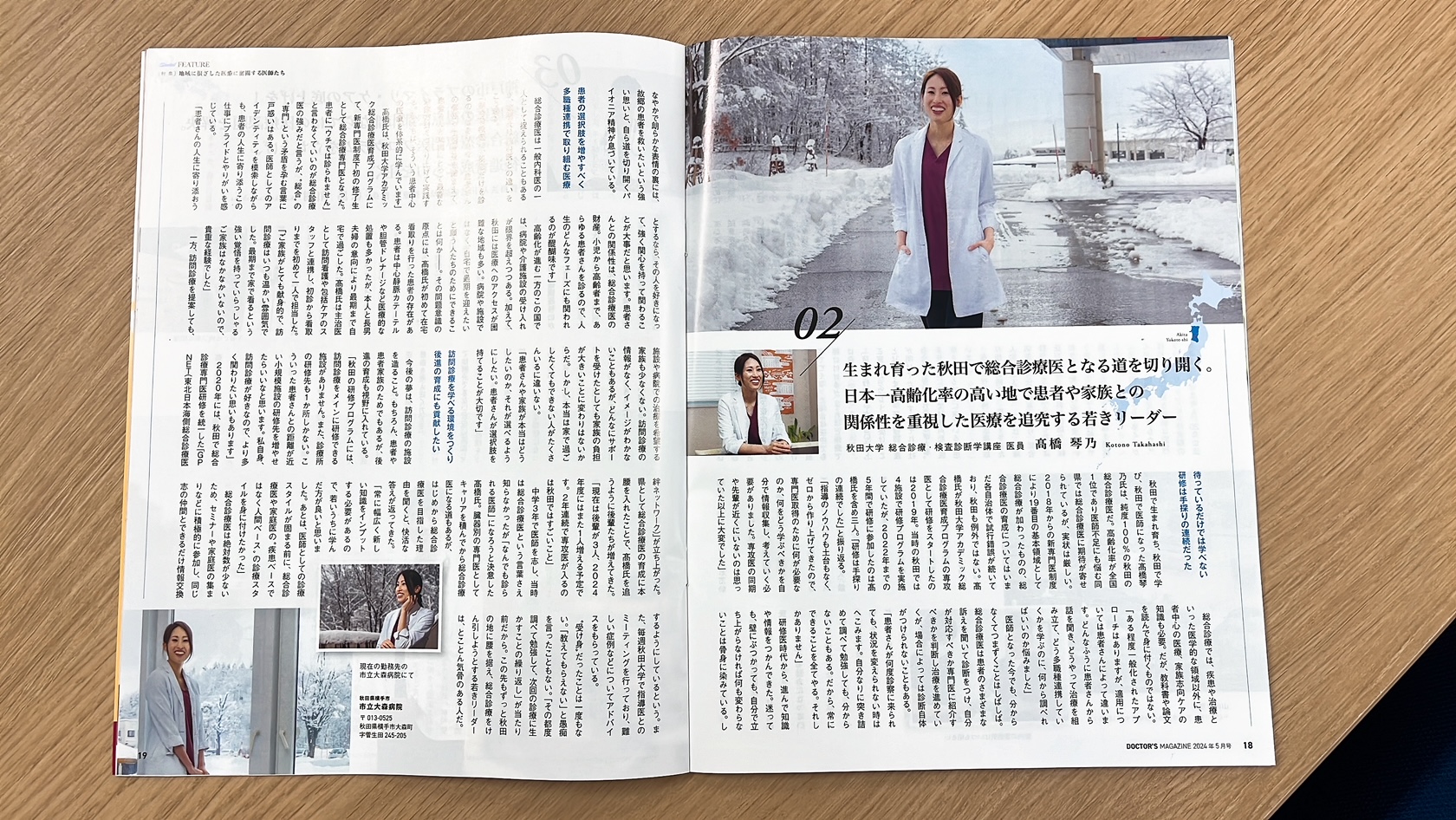 DOCTOR’S MAGAZINE 2024年5月号に髙橋琴乃先生のインタビュー記事が掲載されました! HOME DOCTOR’S MAGAZINE 2024年5月号に髙橋琴乃先生のインタビュー記事が掲載されました! 特集:地域に根ざした医療に奮闘する医師たち vol.3 p18-19 「生まれ育った秋田で総合診療医となる道を切り開く。日本一高齢化率の高い地で患者や家族との関係性を重視した医療を追求する若きリーダー」