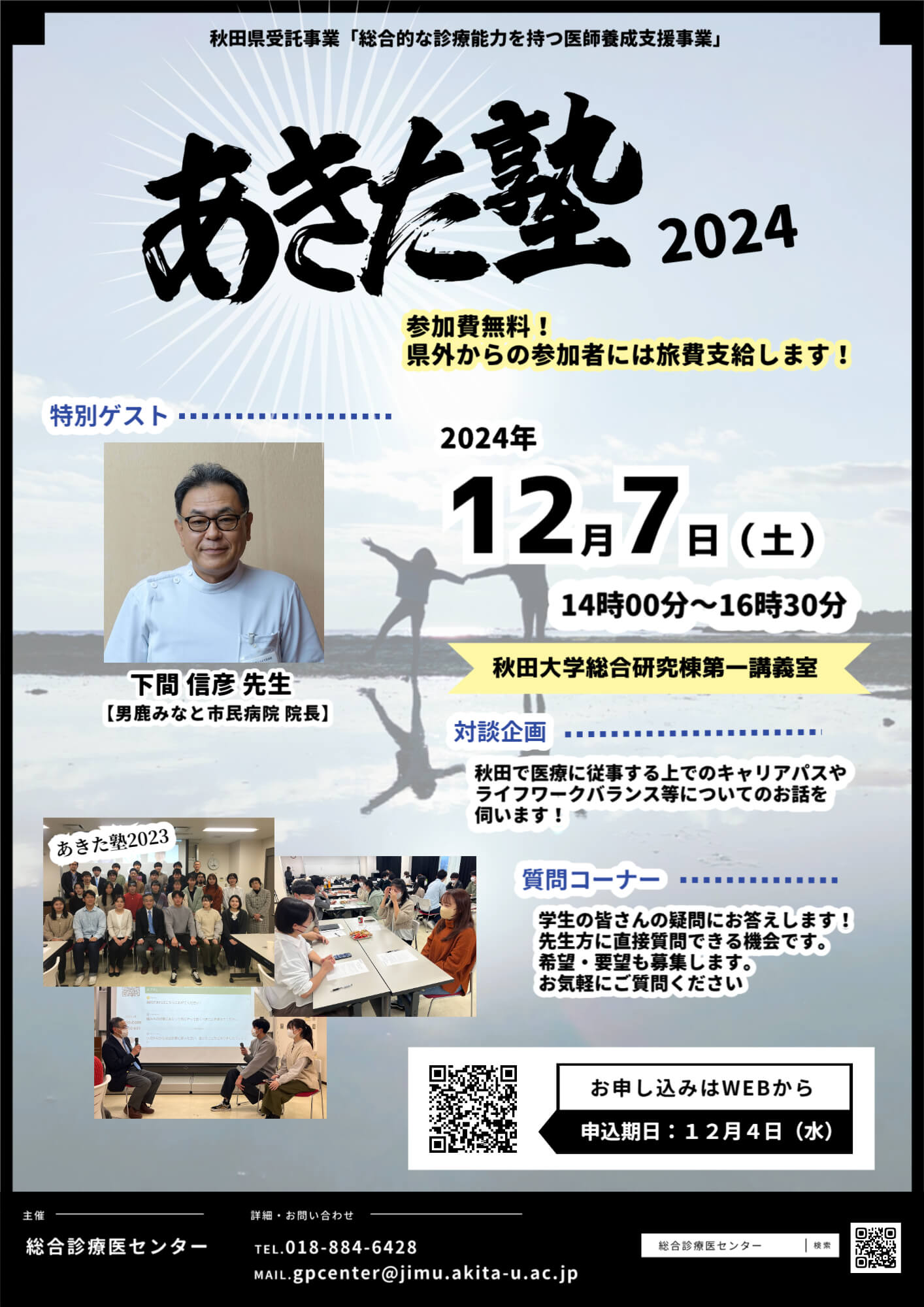 今年は特別講師に”男鹿みなと市民病院の下間信彦 院長”をお迎えします。外科医としての経験、そして地域診療についての興味深いお話が聞ける機会です!