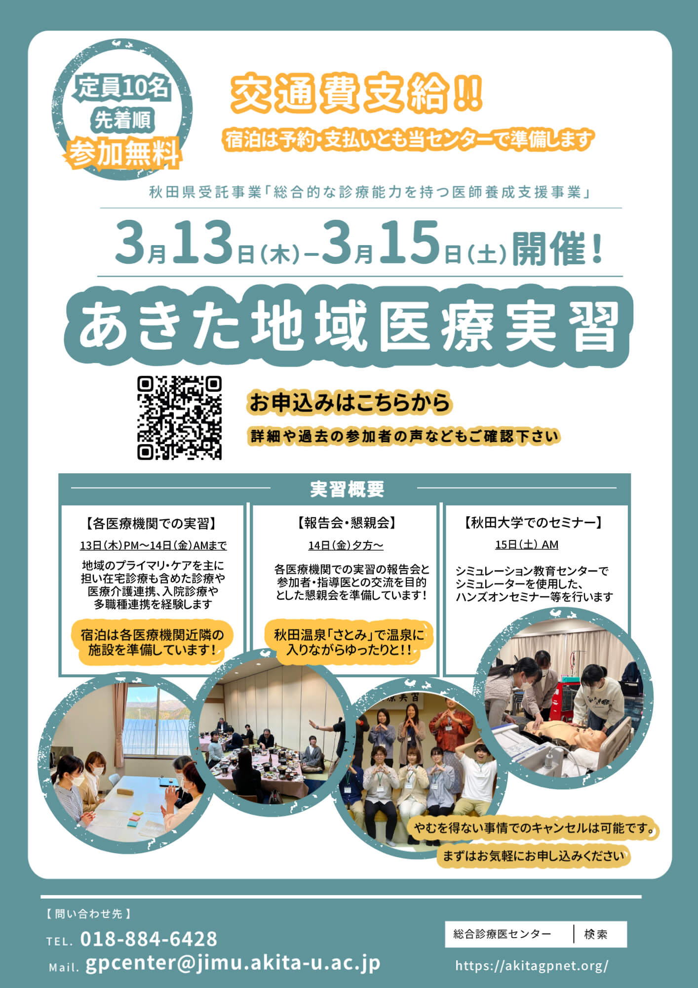 ※詳細・募集要項はこちらから 【会 場】 各実習医療施設、秋田大学医学部附属病院 【参 加 費】 無料 【交 通 費】 支給します(宿泊施設は当センターが準備します) 【募集人数】 10名 【申 込】 下記URL または フライヤーQRコードからお願いします
