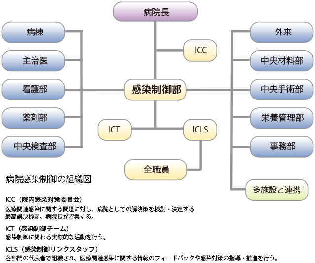 感染制御部は、インフェクションコントロールチーム(ICT)を中心に、医療関連感染防止対策の組織として感染制御全般に関与しています。ICTのリーダーは部長が務めており、そのメンバーには、感染症専門医・インフェクションコントロールドクター(ICD)はじめ、各診療科からの感染症診療に精通した医師、感染管理認定看護師(CNIC)、感染制御専門薬剤師、臨床検査技師、事務職員が加わっています。