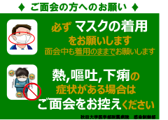 咳エチケットや、面会時の注意事項・面会制限について、ポスターで注意喚起しています。インフルエンザや感染性胃腸炎等の流行期には、院内放送でも注意を呼びかけています。