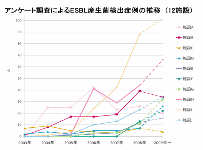 例えば、多くの抗菌薬に耐性のESBL産生菌が増えているといわれていますが、どの程度施設間、地域間格差があるのでしょうか。この実態を調査するために、私たちは2009年秋に県内の医療施設に対してアンケート調査を行いました。