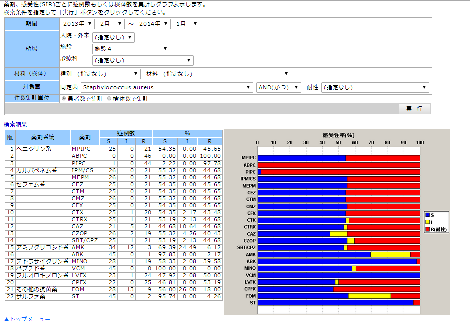 例えば、ある目的の菌がどのような抗菌薬に対して感受性を持っているか知りたい場合、条件を指定してワンクリックすると以下のような画面が現れます。