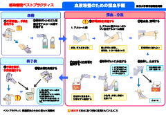 「感染管理ベストプラクティス」は、医療処置や患者ケアの作業の流れのなかで感染対策上、特に重要な部分のリスクを分析し、これに対して科学的根拠のある解決策を検討したうえで作成した手順書です。内容の遵守をはかることで、スタッフ教育や感染対策の改善に活用できます。各施設の実情に応じて作成されるものですが、ここでは当院のマニュアルを一部紹介します(医療従事者向けです) 。