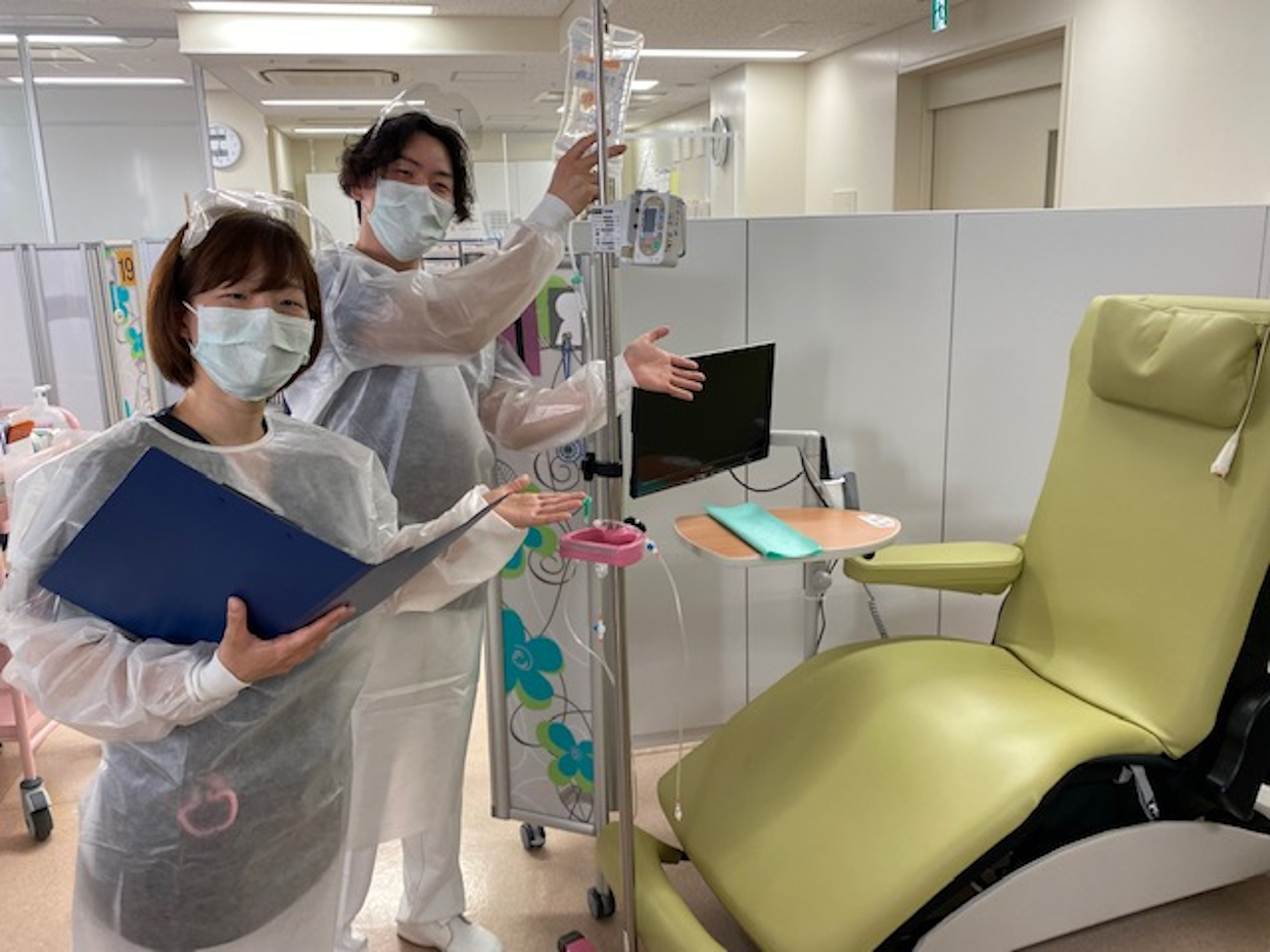 外来化学療法室では、専門性の高い看護師が、医師、薬剤師、外来看護師、病棟看護師など多職種と連携を図りながら患者さんが安心して治療が受けられるよう看護をしています。スタッフの安全も考慮しつつ日々患者さんへの安全な投与を行っています。