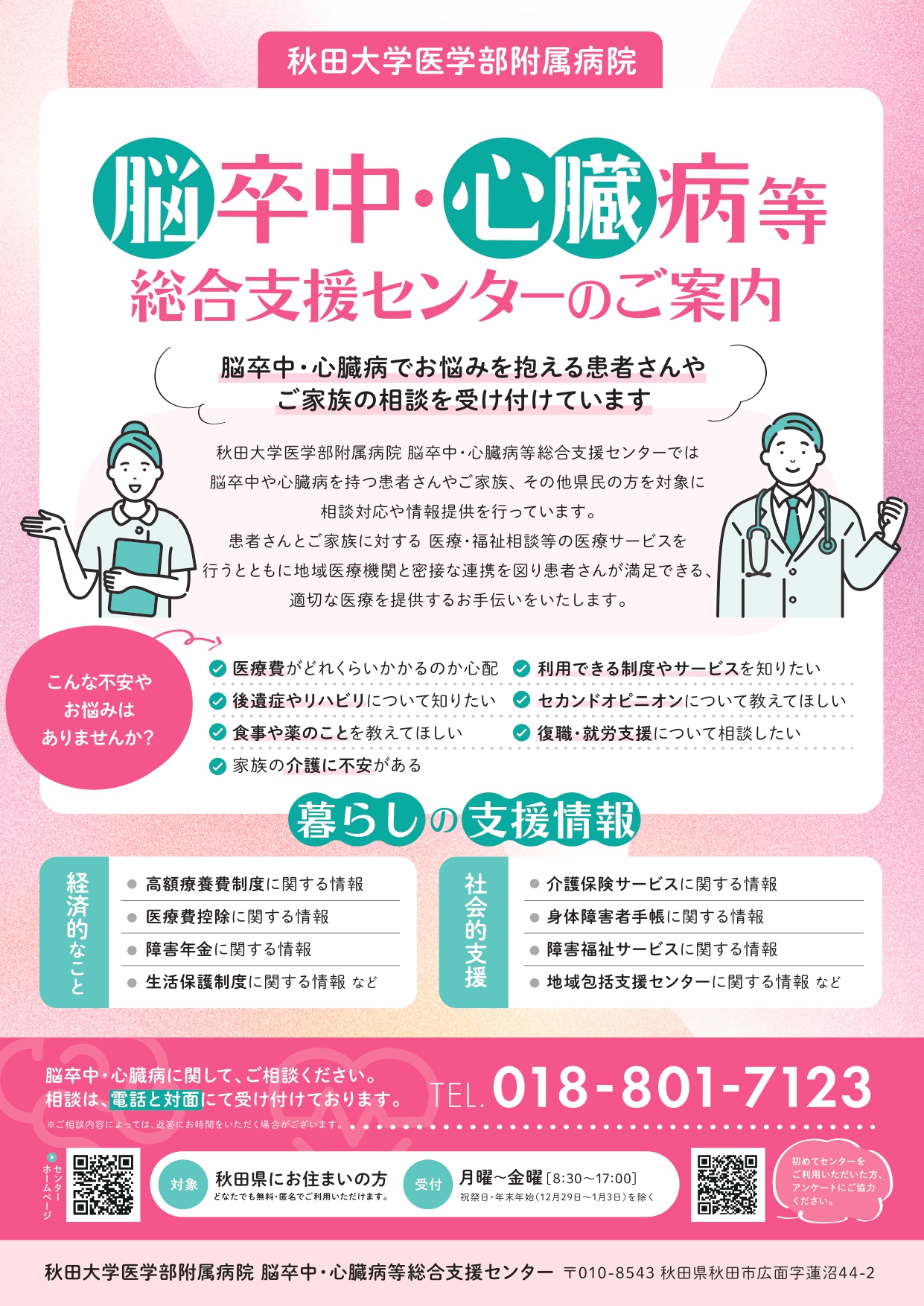 脳卒中や心臓病についてご不安やお悩みがある方のために、電話・対面による相談窓口を設置しています。
