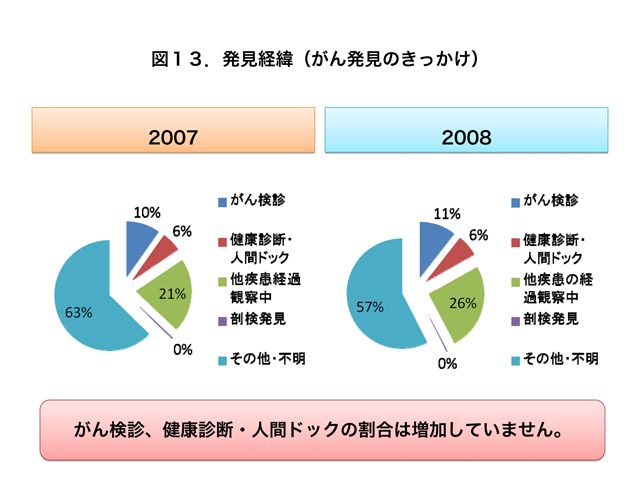 がん検診および健康診断・人間ドックががん発見のきっかけとなった2008年の患者さんの割合はそれぞれ11%、6%で、2007年と較べてその割合は増加していませんでした。全国値はがん検診7.7%、健康診断・人間ドック8.0%であり、両者を合わせた数字は秋田県がやや上回っています(図13)。