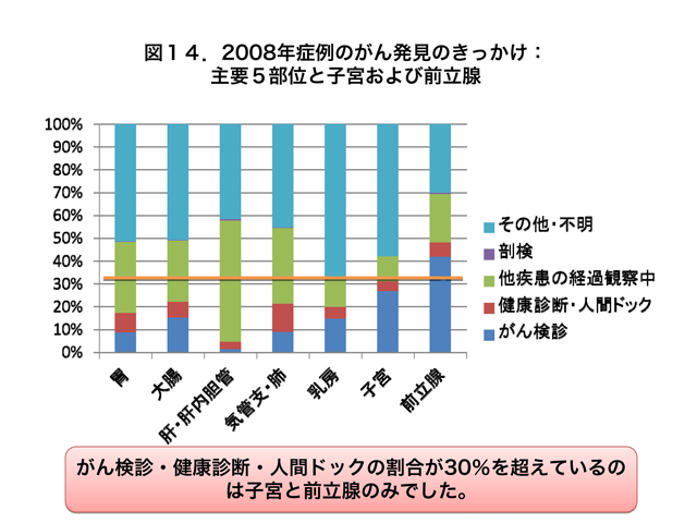 がんの種類別にがん発見のきっかけが何であったかについてみると、がん検診であった割合は部位により大きく異なっています。がん検診・健康診断・人間ドックががん発見のきっかけとなっている割合が30%を超えているのは前立腺がんと子宮がんのみでした(図14)。
