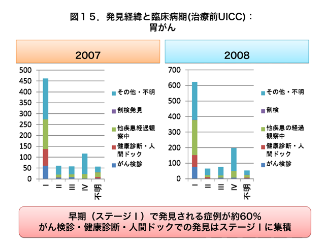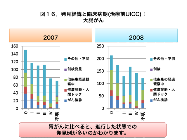 治療開始前に受診した胃がんおよび大腸がんでは、がん検診および健康診断・人間ドックで発見された胃がんの多くはステージIに集積しているのがわかります(図15、図16)。