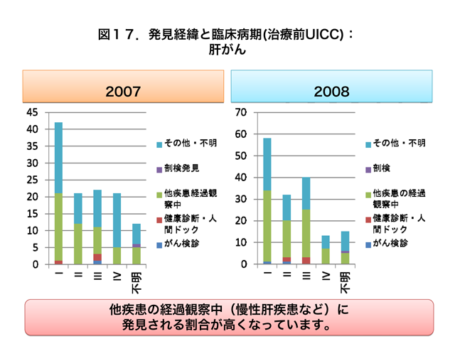 肝がんは他疾患の経過観察中に発見される割合が高く、これは慢性ウイルス性肝炎の治療中あるいは経過観察中に発見されることが多いためであると考えられます(図17)。