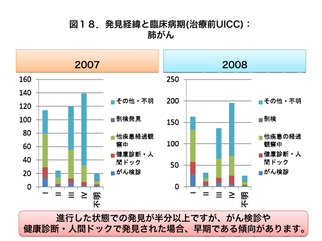 がん検診で発見された肺がんは早期に若干集積しているようにみえますが、進行期にも分布しています(図18)。