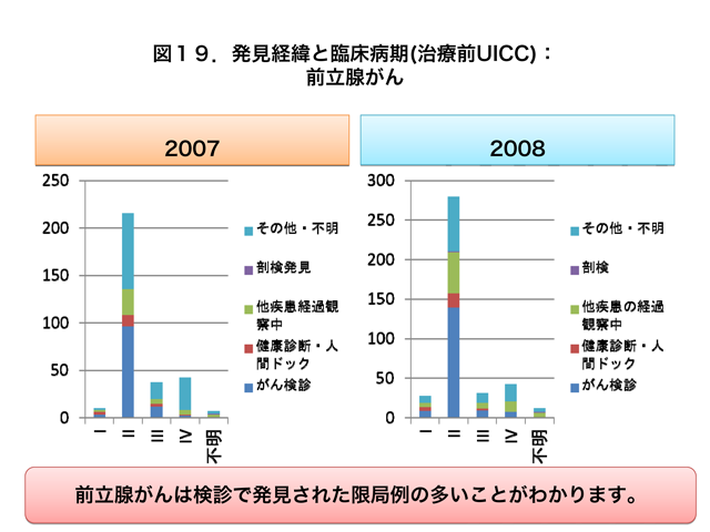 前立腺がんでは、がん検診で発見された患者さんの多くはステージIIに集積しています(図19)。