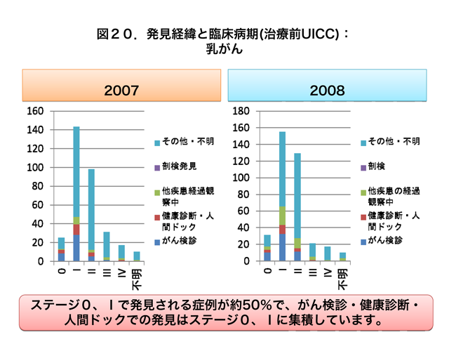 乳がんではがん検診および健康診断・人間ドックで発見された患者さんは早期に分布しています(図20)。