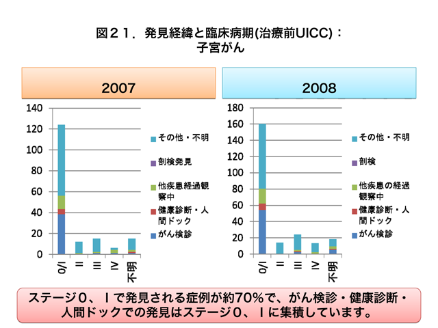 がん検診で発見された子宮がんはステージ0およびIに集積しています(図21)。