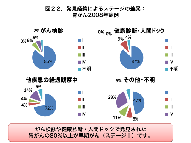 治療開始前に受診した胃がんについて調べてみますと、がん検診や健康診断・人間ドックで発見された胃がんの多くは早期の段階(ステージI)で発見されていることがわかります(図22)。