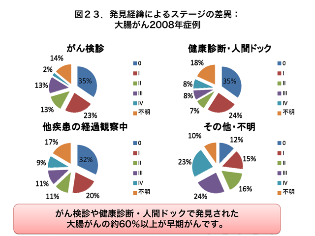 同様に、大腸がんについて調べてみますと、がん検診や健康診断・人間ドックで発見された大腸がんの約60%は早期段階のがんでした(図23)。