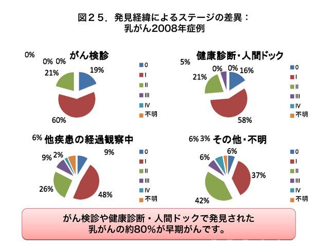がん検診や健康診断・人間ドックで発見された乳がんの約80%が早期がんですが、有症状受診を含むその他・不明のきっかけの場合、その割合は低くなります(図25)。