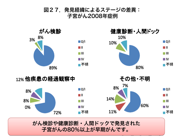同様に、がん検診・健康診断・人間ドックで発見された子宮がんの80%以上が早期がんです(図27)。