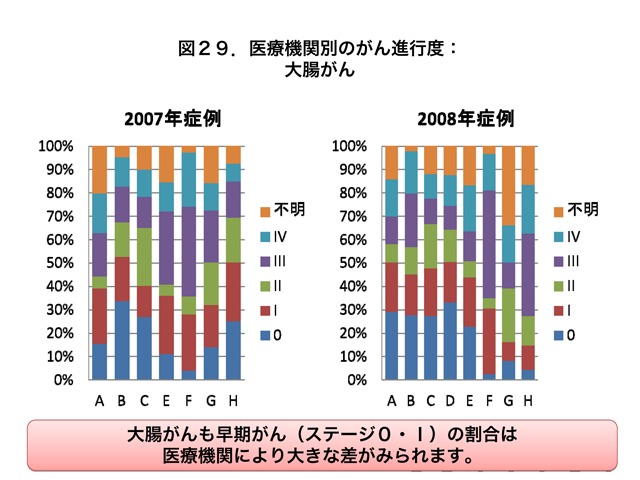 胃がんあるいは大腸がんと診断されたときの早期がん・進行がんの割合は、施設間で大きな差があることが2007年のみならず2008年の院内がん登録データでも明らかとなりました。がんの治療成績は患者さんの年齢や合併症の有無に加えて、がんの進行度によっても予後は大きく異なりますので、施設間のがん治療成績を比較する場合には、その医療機関を受診された患者さんの状態を考慮に入れた比較が重要です。