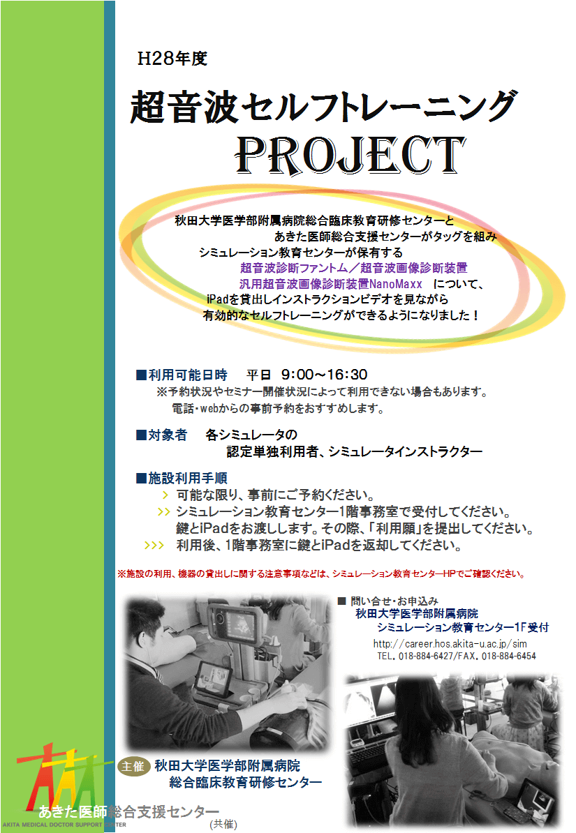 超音波セルフトレーニングPROJECTのお知らせ 2016.04.13 シミュレーション教育センターが保有する超音波機器について、iPadでインストラクションビデオを見ながら自己学習することが可能です。好評につき昨年度より継続されることとなったこのプロジェクト、皆さまのご利用をお待ちしております! ※利用の際に提出いただく「利用願」は、センター1階の受付に準備しております。