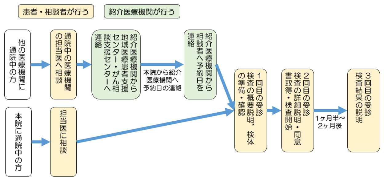 がん遺伝子パネル検査のために受診を希望される患者さんがおりましたら、下記の①「がん遺伝子パネル検査と検体についてのご案内」、②「がん遺伝子パネル検査の流れ」をご参照の上、がん遺伝子パネル検査のご準備をお願い致します。