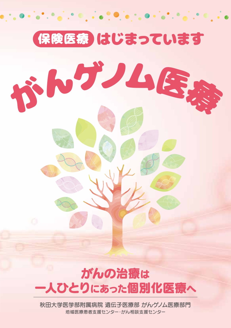 秋田大学医学部附属病院で「がん遺伝子パネル検査」を希望される方はこのページをお読みになり、内容をご理解いただいた上で、担当医にご相談下さい。他の医療機関に通院中の患者さんは当該医療機関の担当医を通じて、本院地域医療患者支援センター・がん相談支援センターへご相談願います。