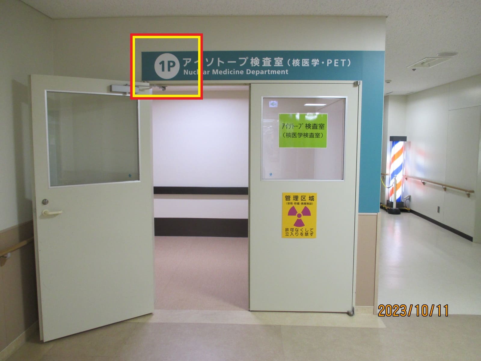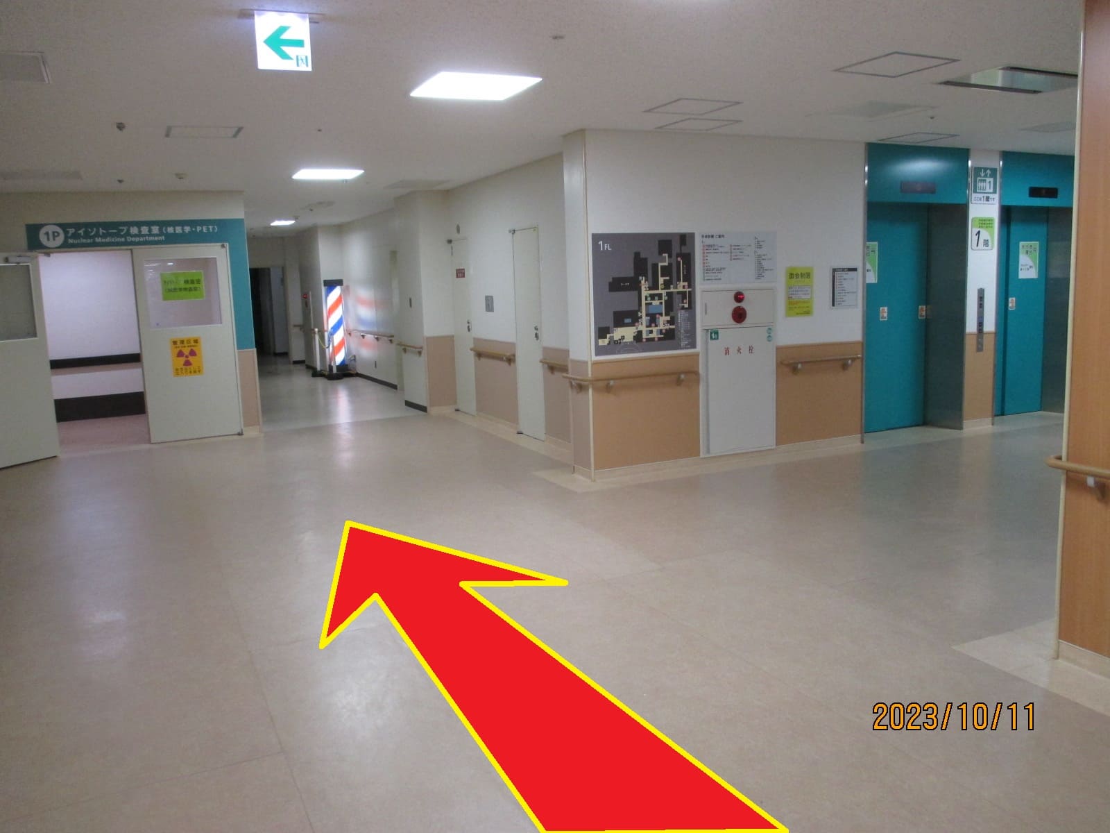 ③第一病棟用エレベータホールを右に臨みつつ、さらに直進します。