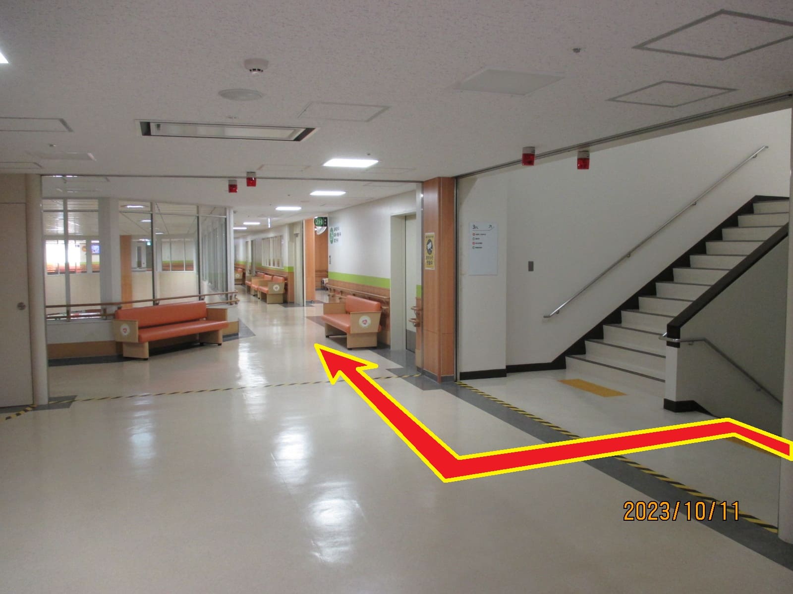 ①ホール右奥階段(または、右手回り込んで真裏エレベータ)で2階へ上がります。