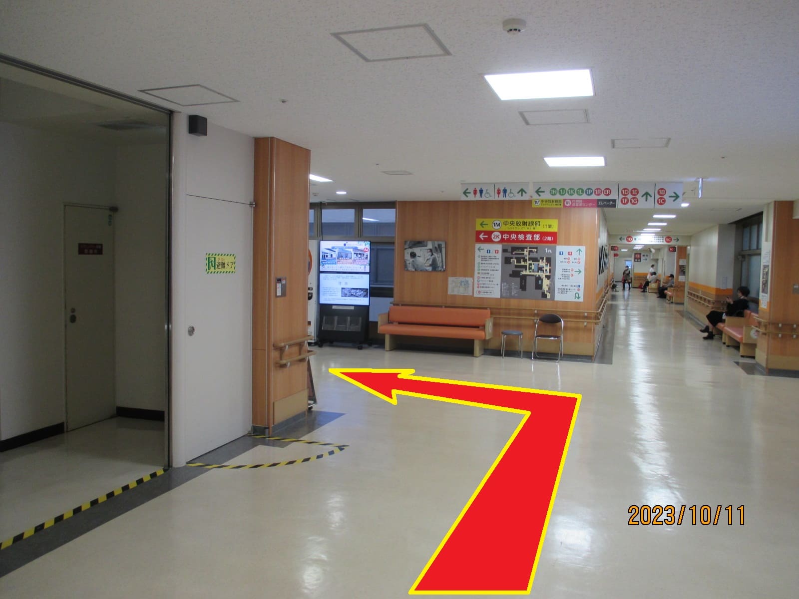 ①ホール右奥階段前を(左に臨みながら)過ぎ、すぐ左に曲がります。