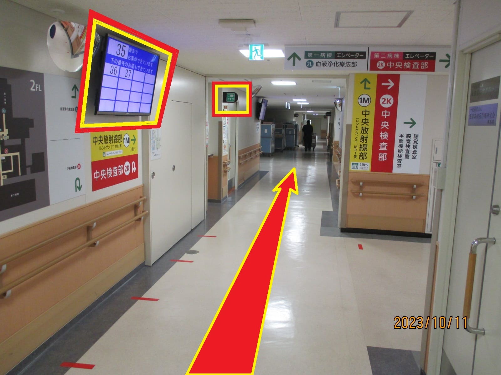 ③通路左手のエレベータ、お薬窓口(周辺上に番号モニタ)を通り過ぎ直進します。
