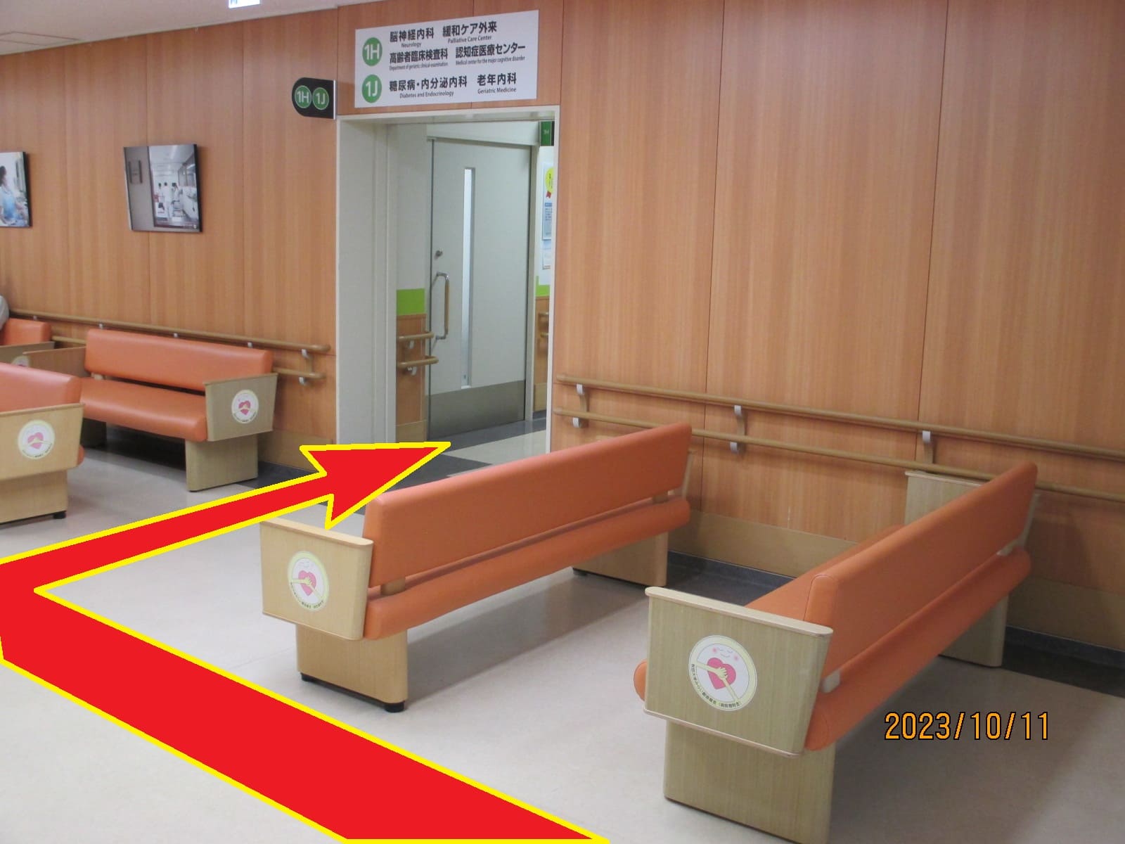 ①ホール右奥階段前を(左に臨みながら)過ぎ、すぐ左に曲がります。
