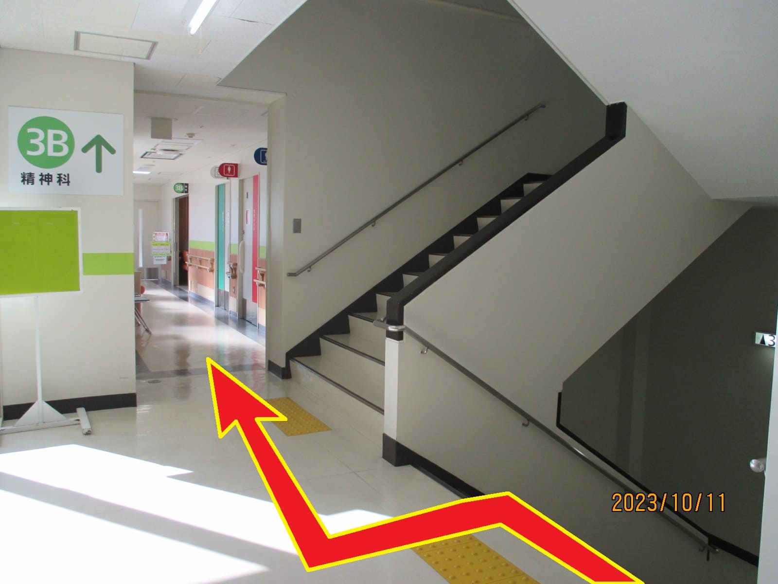 ①ホール右奥階段( または、右手回り込んで真裏エレベータ)で3階へ上がります。