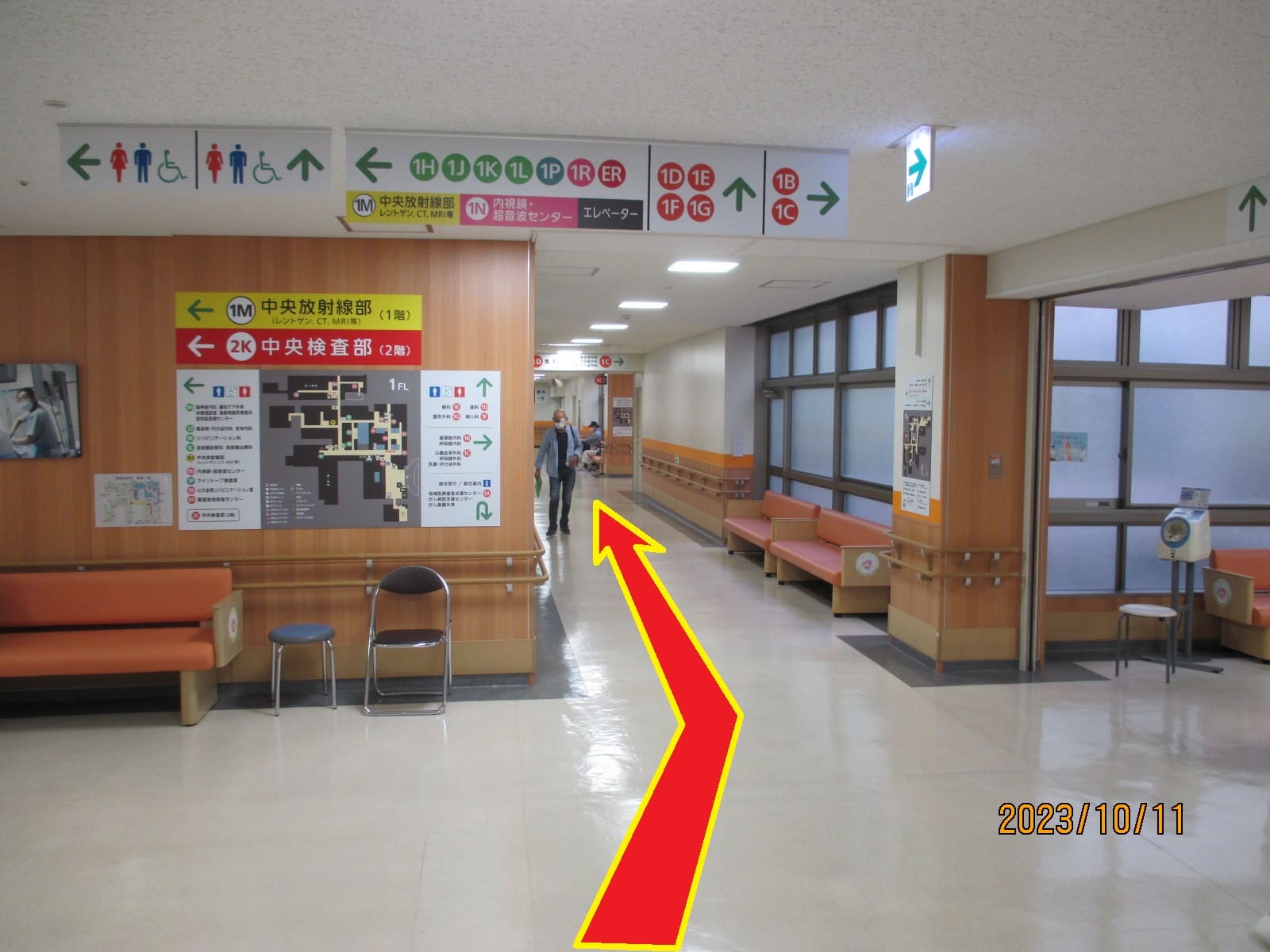 ①ホール右奥階段前を(左に臨みながら)過ぎ、曲がらず右前通路を直進します。