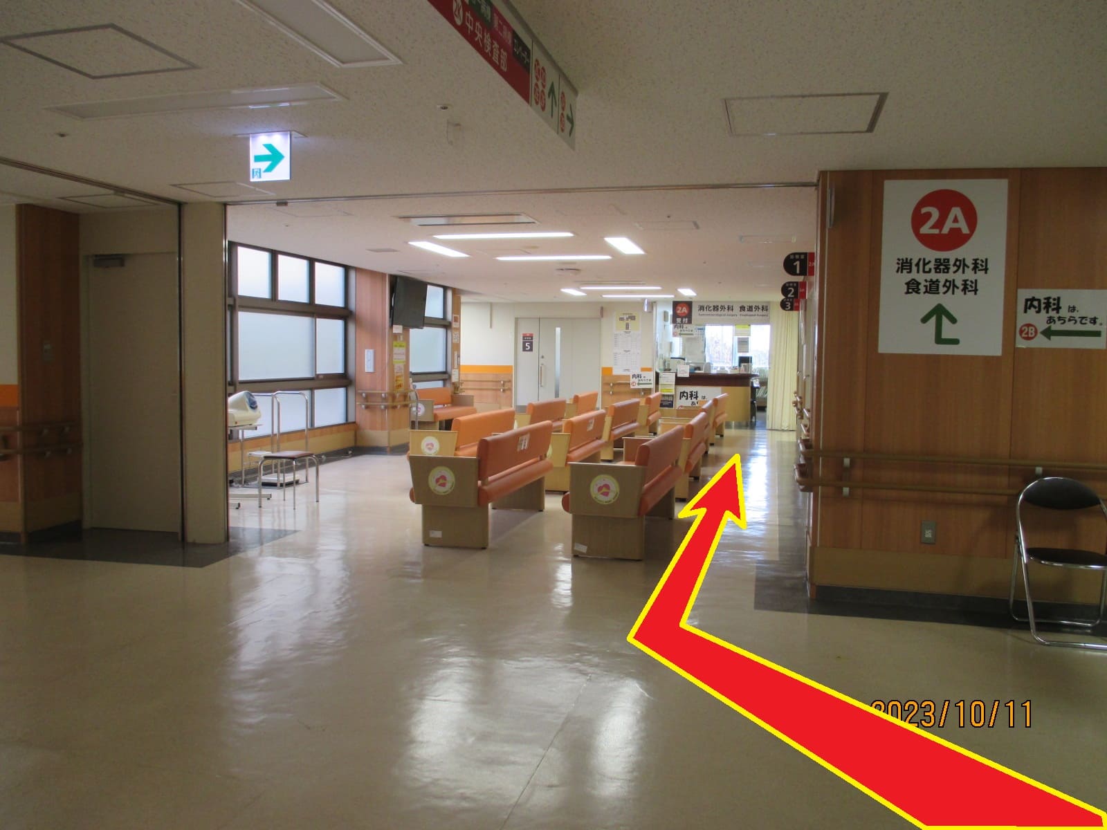 ②階段を上って左前(エレベータ降り右手)通路を進みます。