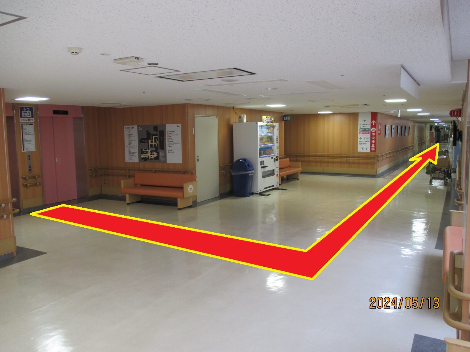 ①ホール右奥階段前を(左に臨みながら)過ぎ、すぐ左に曲がり、自販機向かいのエレベータで2階へ上がります。