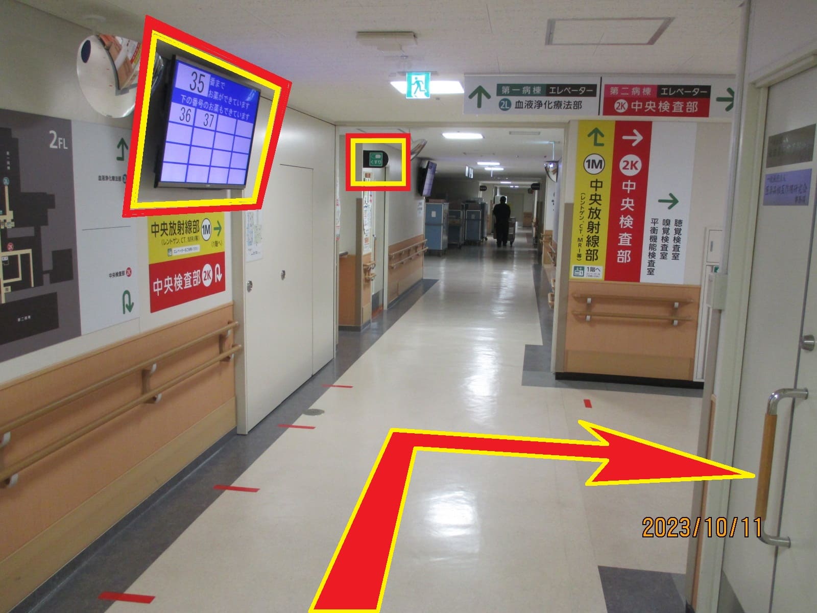 ③お薬窓口(周辺上に番号モニタ)前(一つ目の右T字路)を右手に曲がります。