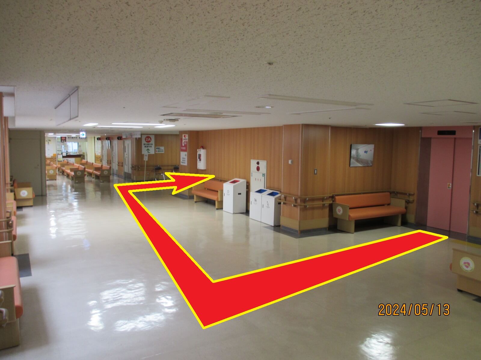 ①ホール右奥階段前を(左に臨みながら)過ぎ、すぐ左に曲がり、自販機向かいのエレベータで2階へ上がります。