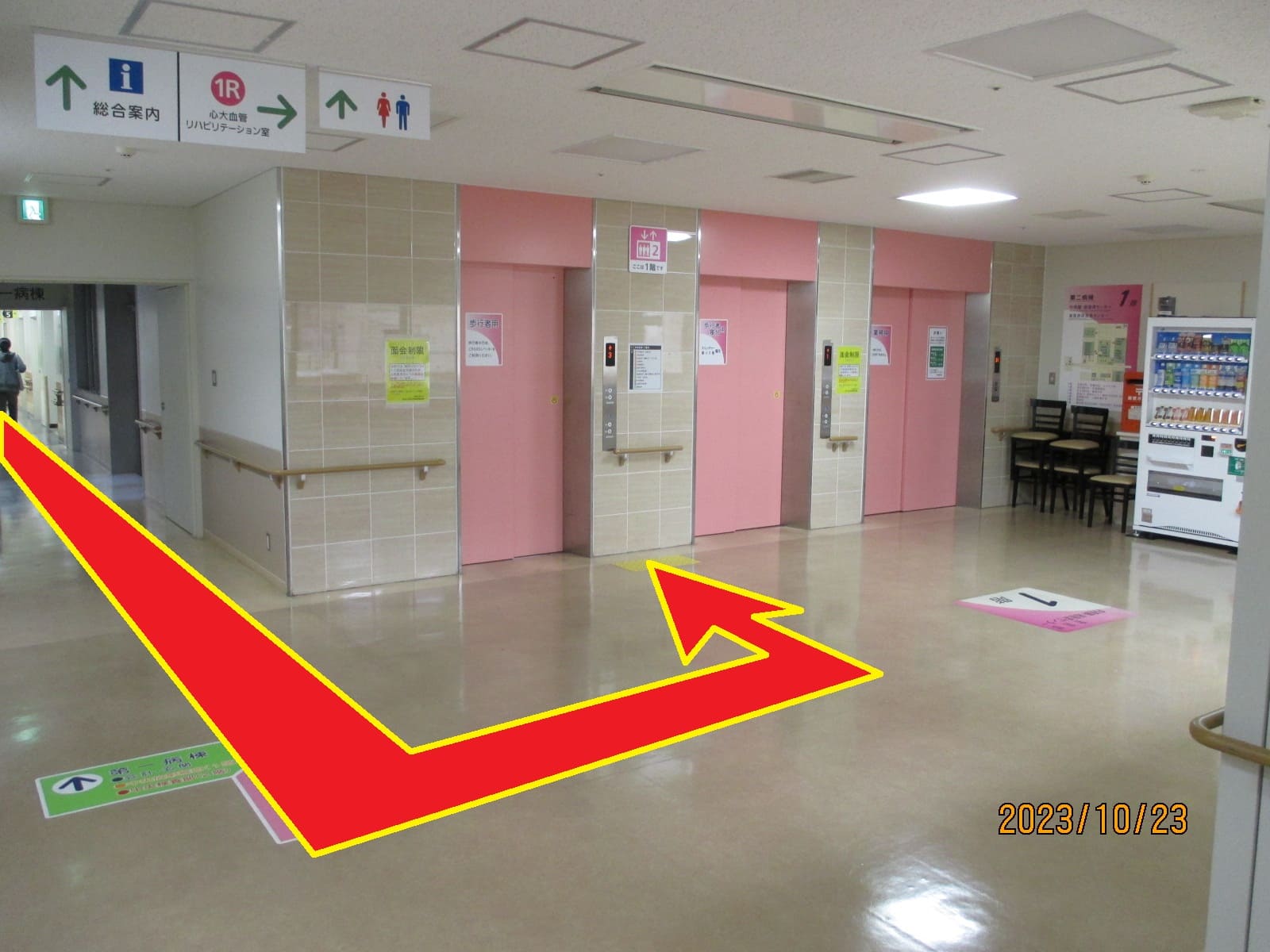 ⑤左手に第二病棟用エレベータホールが見えますので目的階へ上がります。